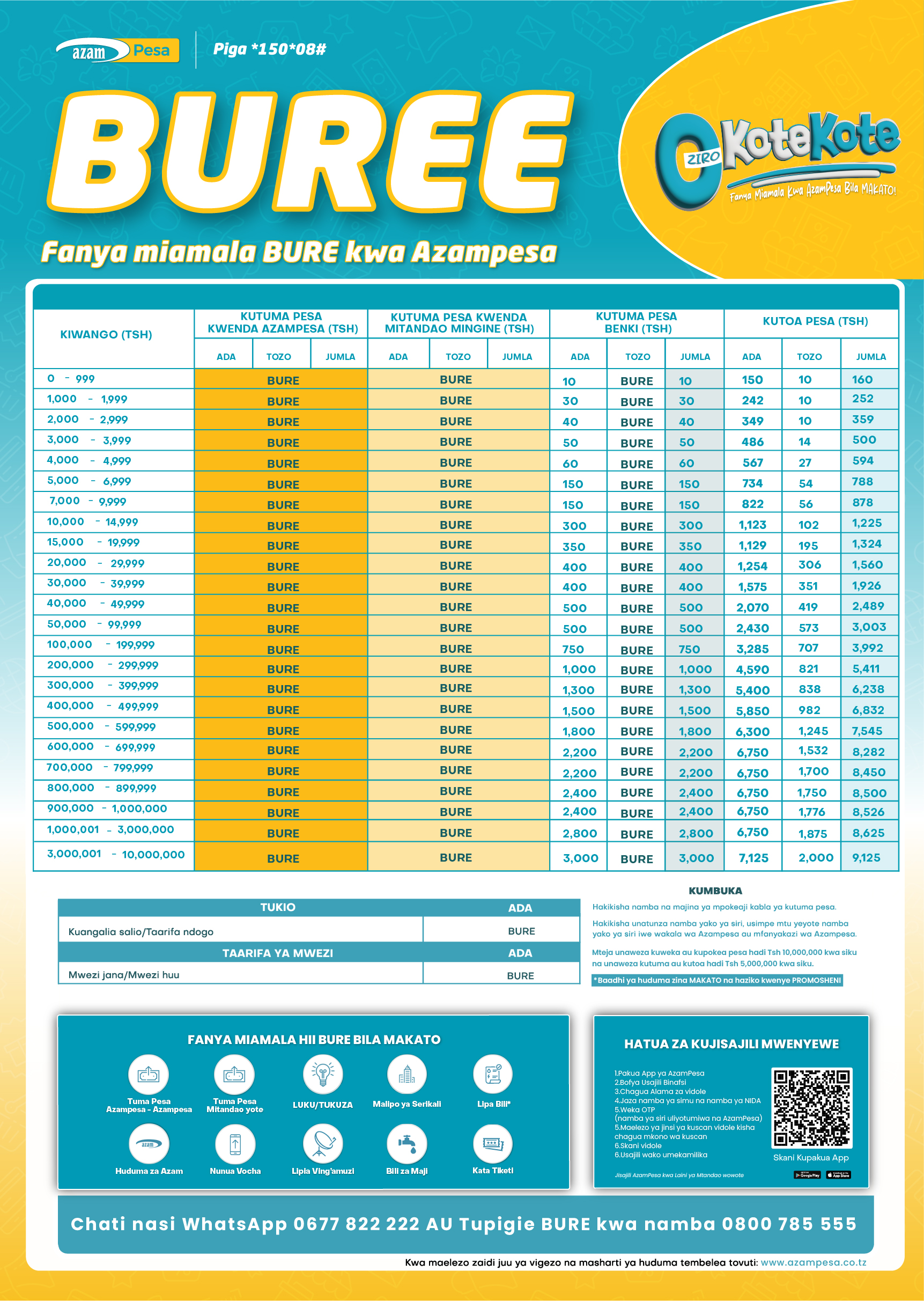Yote yaliyomo kwenye tovuti hii ni mali ya AzamPesa. Haki zote zimehifadhiwa. Hakimiliki. Vigezo Na Masharti Nyumbani Makato Usajili Binafsi Kusajiliwa Na Msajili Wetu Blogu Tuma/Toa Pesa Lipia Bili Huduma Za Kifedha Malipo Ya Serikali Nunua Muda Wa Maongezi Huduma Za Azam Android iOS Copyright 2025, AzamPesa FollowFollowFollowFollow